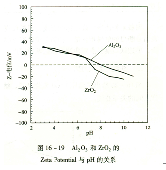 穩定分散體系的形成要依賴于顆粒表面吸附的電荷。經過解離后的顆粒,由于布朗運動,碰撞在一起有可能產生新的團聚,因此要采取適當的措施,阻止顆粒的重新團聚。在實驗中采用了雙電層的辦法阻止顆粒的重新團聚。納米Al2o3和Zro2顆粒有大的比表面積,常常產生鍵的不飽和性,致使納米Al203和Zr02顆粒表面失去電中性而帶電,吸引電解質溶液中帶相反電荷的離子到Al2o3和Zro2顆粒的表面,以平衡其電荷。靠近納米顆粒表面的一層吸附緊密,平衡納米顆粒表面的電性,使電位急劇下降;稍遠一些形成的吸附較弱,電位下降緩慢。這樣在整個吸附層中產生電位下降梯度,構成雙電層。納米Al2o3和Zr02粒子在水溶液中的帶電情況與溶液的pH有關,pH不同,其表面可帶正電、負電和呈電中性。當pH較小時,粒子表面形成M-OH2鍵(從代表金屬離子,如Al、Ti、Zr等),導致顆粒表面帶正電;當pH較高時,顆粒表面形成M-0鍵,導致顆粒表面帶負電;當pH處于中間值時,納米顆粒表面形成M-OH鍵,呈電中性。基于上述原理,利用Zeta電位儀測出了Al203和Zr02粉末的pH與其顆粒表面帶電情況的關系,如圖下圖所示。